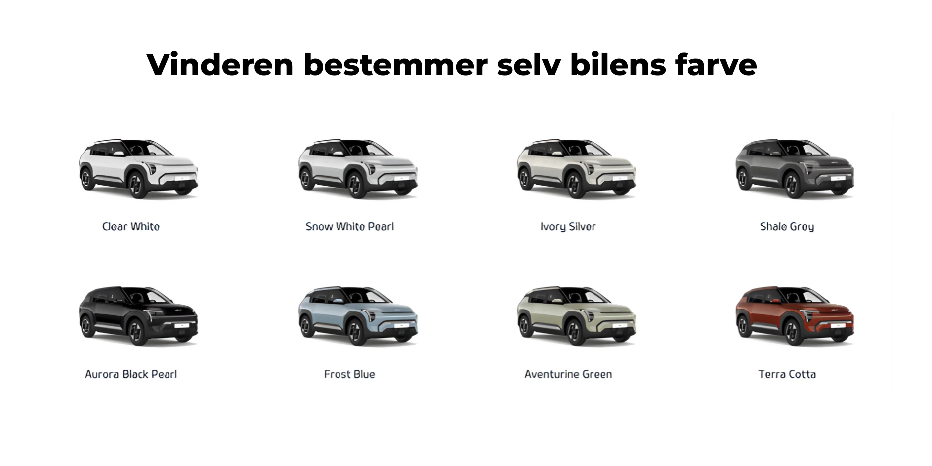 Bilen udbudt som præmie er en Kia EV3 Standard Range. Bilen leveres uden ekstraudstyr. Som vinder vælger du selv bilens farve. De biler, der vises i annoncer og billeder, kan være vist med ekstraudstyr.